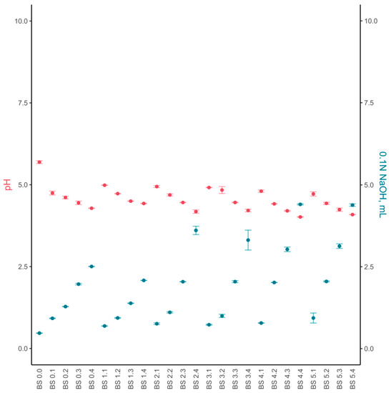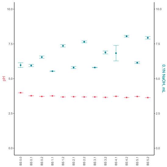 The pH (red dots) and titratable acidity (blue dots) values of orange-juice kombucha during backslopping cycles. Titratable acidity units are mL of 0.1 N NaOH. The abbreviation BS stands for backslopping. The first number shows the backslopping cycle and the second number refers to the day of the backslopping cycle.