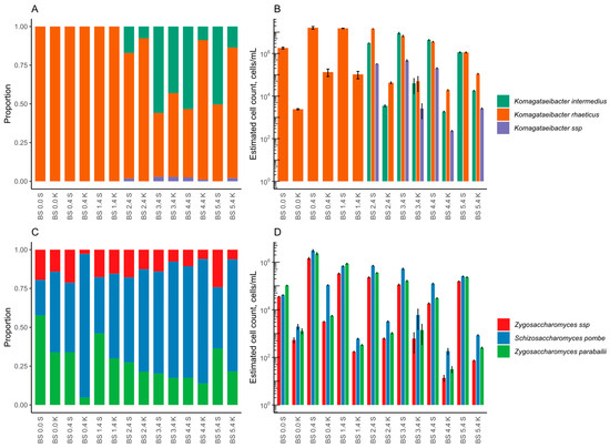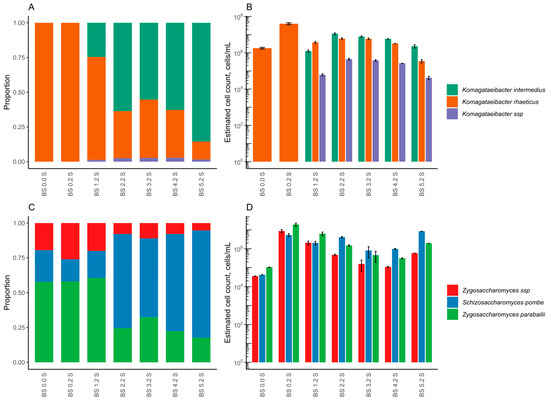 The yeasts community was detected by ITS2 metabarcoding along with the cell numbers determined by ITS-specific qPCR in analysed time points, as presented in Figure 5C,D, respectively. The results showed that two genera were detected throughout the experiment. In the beginning, at the point of BS 0.0, the dominant species was Zygosaccharomyces parabailii, with a proportion of 0.58, followed by Schizosaccharomyces pombe and Zygosaccharomyces spp., with proportions of 0.23 and 0.20, respectively. Similarly to the bacterial cell load, the lowest yeast cell count was detected at the time point of BS 0.0, 1.81 ± 0.05 × 105 cells/mL. In the same way, the highest total yeast cell count was measured at the point of BS 0.2, 3.35 ± 0.62 × 107 cells/mL, while species abundances did not change remarkably, with dominating Z. parabailii followed by the Zygosaccharomyces spp. and S. pombe. From BS 2.2 until the end (BS 5.2), the S. pombe started to dominate with a proportion of 0.68 and had a cell count of 4.10 ± 0.31 × 106 cells/mL. A minor decrease of dominance occurred at the point of BS 3.2, but in BS 4.2 and BS 5.2, the S. pombe content was increased to 0.70 and 0.77, respectively. Therefore, the S. pombe dominated at the end of the backslopping cycles. Although, at the end of backslopping, the yeast cell load increased to 1.10 × 107 cells/mL, it is still lower than in the beginning.