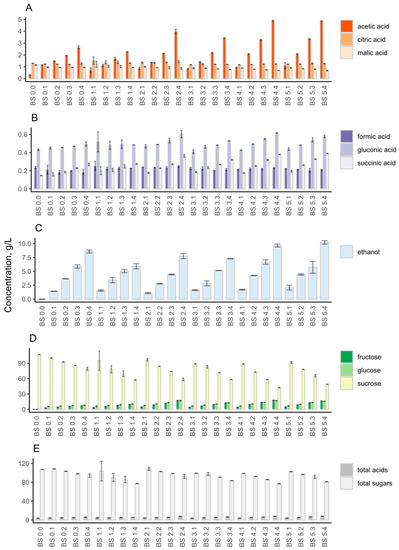 Organic acids, sugars, and ethanol concentrations (g/L) of orange-juice kombucha during backslopping. Concentrations of acetic, citric, and malic acid (A); gluconic, glucuronic, lactic, and succinic acid (B); ethanol (C); fructose, glucose, and sucrose (D); and total acids and sugars (E) are indicated. The abbreviation BS stands for backslopping. The first number shows the backslopping cycle and the second number states the day of the backslopping cycle.
