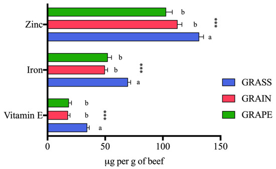 Main micronutrient concentrations in beef by diet (μg per g of beef). Values are reported as means ± standard error. Different letters denote statistical significance at p < 0.05 (‘***’ p < 0.001). GRASS: beef fed a diverse pasture; GRAIN: beef fed a total mixed ration (TMR); GRAPE: beef fed TMR + 5% DM grapeseed extract.