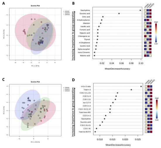 (A) Principal component analysis (PCA) plot using phytochemicals only showing separation and clusters based on finishing diet with some overlaps. (B) Random forest (RF) variable importance plot showing main phytochemicals capable of discriminating beef based on finishing diet. (C) PCA plot using phytochemicals and fatty acids showing three clusters based on finishing diets. (D) RF variable importance plot showing main fatty acids and phytochemicals capable of discriminating beef based on finishing diet. For RF plots, the y-axis represents phytochemicals in order of importance for group classification (from top to bottom). The x-axis shows mean decrease accuracy, with a higher value indicating the importance of that phytochemical in predicting groups. PC: principal component; total n-3: total omega-3 fatty acids; total trans-MU: total trans monounsaturated fatty acids; total iso-BCFA: total iso branched chain fatty acids; GRASS: beef fed a diverse pasture; GRAIN: beef fed a total mixed ration (TMR); GRAPE: beef fed TMR + 5% DM grapeseed extract.
