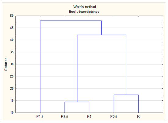 Groups of observations exhibiting similar behavior were grouped into clusters. The derived dendrogram made it possible to distinguish three distinct groups. Cluster 1 included the control variant and the variant with the lowest dose of lyophilizate (P0.5), indicating that this procedure had little effect on the result differentiation. Cluster 2 included variants with higher doses of lyophilized dragon fruit pulp, i.e., 2.5% (P2.5) and 4% (P4), which confirms the impact of higher doses of smog fruit pulp on the quality and nutritional potential of pork meat products. Conversely, the research variant P1.5 (with a 1.5% plant additive) was grouped completely separately as cluster 3.