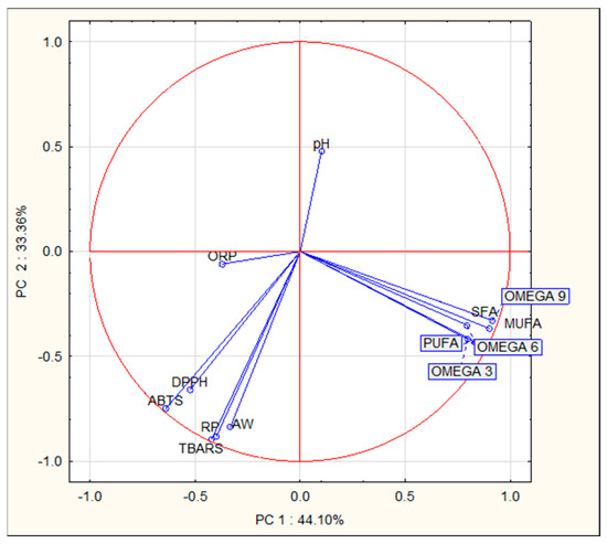 The results of the PCA (Figure 2) and the correlation between variables showed that certain components of the pork meat product were associated with changes in other variables. Right after production, the content of fatty acids (defined as SFA, MUFA, PUFA, and OMEGA acids (−3, −6, −9)) constituted a distinct factor affecting the diversity of the analyzed variants of pork meat products, indicating a strong interrelationship between these two variables during the experiment. Additionally, fatty acids exhibited negative correlations with product quality features such as TBARS, aw, and the antioxidant activity (ABTS, DPPH, and RP) of extracts from pork meat products. The second principal component, explaining 33.36% of the cumulative variance, displayed a high correlation only with pH.
