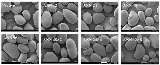 Figure 1 showed the scanning electron microscope (SEM) images of water caltrop starch after continuous ANN and cycled ANN. It was observed that native water caltrop starch showed an oval and irregular shape. Various continuous and cycled ANN treatments did not cause great change on the surface microstructure of the starch granules, which remained intact. The result was consistent with the findings in the literature, which generally inferred that there was no significant difference in the appearance of starch from different sources and structures after annealing [18,26,27], such as yam starch under an annealing condition at 50 °C for 24 h [26]. Likewise, in a study of potato starch, which had a B-type starch crystalline structure, it was reported that continuous and cycled annealing treatment at 55 °C for up to 96 h did not cause a significant change in the shape of starch granules, except that only part of the starch granules was dented [18]. Moreover, in a study of mung bean starch, which had a C-type starch crystalline structure, it was reported that continuous and cycled annealing treatments at 50 °C for up to 96 h did not change the surface microstructure of starch granules, except that the shallow groove on surface became deeper [27].
