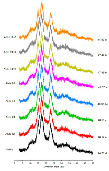 ΔH is related to the enthalpy for starch gelatinization and is also associated with the energy of the double helix in amylopectin disintegration [39]. Table 1 shows that continuous ANN-modified water caltrop starch required a higher ΔH for phase transition with increasing annealing time, which was attributed to an improvement in double helix registration and the lengthening of double helices through ordering of the unordered ends of double helices [40]. The increase of ΔH proved that annealing had a great effect on making crystalline structure more stable, and the prolonged ANN treatment further facilitated the crystalline structure perfection. However, under a total annealing time of 96 h, the numbers of annealing cycles did not show a definite trend on changing ΔH, possibly due to a combined controversial effect of thermal energy and water during multi-stage annealing [35].