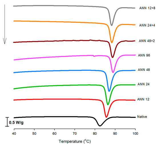 Differential scanning calorimetry (DSC) was used to analyze the thermal characteristics of starch gelatinization transition. As shown in Figure 3, the phase-transition-related endothermic changes started to occur at lower temperatures with a wider temperature range for native water caltrop starch. For continuous ANN treatment, as the annealing time increased, the onset for phase transition started at progressively lower temperatures, accompanied by a narrower phase transition temperature range. However, the numbers of annealing cycles did not impart a significant effect on peak transition temperature.