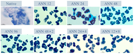 Figure 4 exhibits the iodine-staining morphology of native, continuous ANN and cycled ANN modified starch paste. It demonstrated that the starch granules of native water caltrop starch were essentially destroyed after pasting in RVA, accompanied with significant leaching-out of starch molecules. In contrast, the appearance of all ANN-modified starch paste still retained the intact starch granular borderline, indicating that crystalline perfection restricted the swelling and viscosity development of starch granules during the pasting process [43].