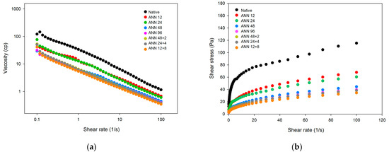 The steady shear properties of water caltrop starch after continuous and cycled ANN treatment are demonstrated in Figure 5. With increasing shear rate, the viscosity of native and all ANN-modified water caltrop starch decreased, indicating that water caltrop starch paste is a shear-thinning fluid. Moreover, native water caltrop starch showed high static yield stress, which was possibly attributed to weak gel formation from short-term starch retrogradation. After continuous and cycled ANN modification, the yield stress of water caltrop starch reduced significantly, possibly because annealing inhibited starch swelling that influenced viscosity development.