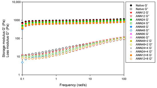 In an oscillatory rheological assessment, storage modulus (G′) represents elastic and solid-like properties, and loss modulus (G″) refers to viscous and liquid-like properties. Figure 6 displayed the frequency dependence of G′ and G″ for native and ANN modified starch. Native water caltrop starch showed the highest G′ and G″, possibly due to starch gel formation by amylose leaching and rearrangement. With increasing the annealing time of continuous ANN, G′ and G″ slightly decreased, implying that the more intact and stable starch structure due to enhanced internal chains resulted in lower swelling power and dynamic modulus [46]. In addition, it was found that the G′ was higher than G″ over the entire frequency range studied, indicating that all water caltrop starch pastes were considered as elastic solids rheologically. When deformation increased, the network structure of water caltrop starch pastes gradually collapsed, leading to significant slope change in G″ over the frequency range studied to weak gel structure [47]. However, under a total tempering time of 96 h, cycle numbers of cycled ANN showed less impact on the dynamic shear rheological properties.