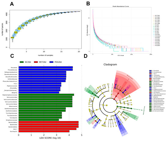 The richness of the gut microbiota: (A) rank abundance curve. The cumulative species curvs reflects the influence of sample number on species diversity. “+” is abnormal value; and (B) species accumulation curves under POS treatment. Significantly different species based on the LDA score (C) and LEfSe taxonomy cladogram (D) identified using the nonparametric factorial Kruskal–Wallis rank sum test at a significance level of 0.05.