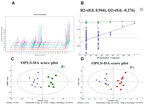 Effects on the gut metabolic structure determined using the orthogonal partial least squares discriminant analysis method: (A) representative GC−MS total ion chromatograms (TIC); (B) OPLS−DA permutation test between the POS (Green), MET (Red), and NC (Blue); and OPLS−DA score plot between (C) POS and NC and (D) MET and NC.