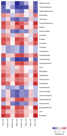 Spearman’s correlations of key species and SCFAs; ** p < 0.01 and * p < 0.05.