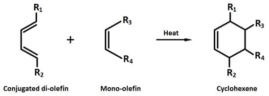 LCD include a wide variety of oxidation products due to the shifts in the position and geometry of the double bonds in polyunsaturated fatty acids []. The measure, which is simple, quick, and fairly inexpensive to determine, correlates well with the total polar compounds as the most common analytical quantity to investigate the health of used frying oils []. Its content increases initially and attains a plateau at advanced levels of deterioration over frying. This is basically due to a balance between the rates of LCD formation and the loss of conjugation resulting from secondary oxidations [] as well as the Diels–Alder dimerization reaction (Figure 1) []. Such a trend is in line with the sigmoidal function of LOOH accumulation developed recently [,].
