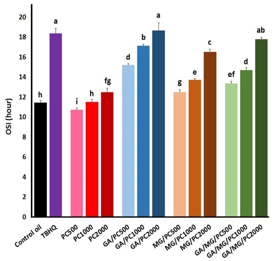 Oxidative stability index (OSI, h) of the control sunflower/palm olein (65:35) oil containing TBHQ (1.2 mM), PC (500–2000 mg/kg), or GA and/or MG (1.2 mM) plus PC. Means ± SD with the same lowercase letters are not significantly different at p < 0.05.