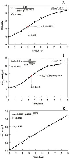 where a, b, c, and d are the equation parameters. LCOmax was a + b. At the equation’s turning point, tT = c, the rate of LCO formation (μmol/g h) reached rmax = 0.25b/d. The normalized rmax (rmax/LCOmax = rn, /h) was calculated from the ratio b/4d(a + b).