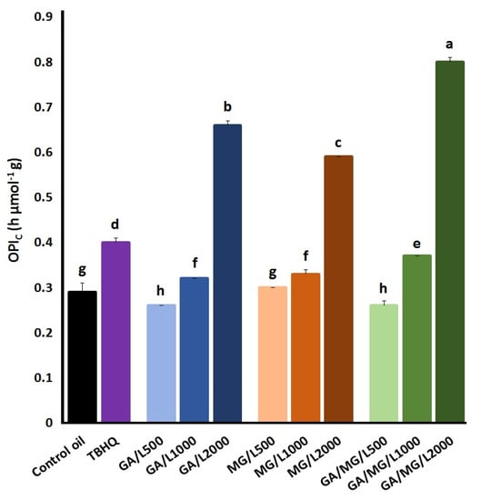 The OSI value of the control oil plus the antioxidative treatments is shown in Figure 2. This measure basically indicates the time resistance of a lipid system to the drastically increased accumulation of a number of volatile organic acids as secondary/tertiary oxidation products in harsh oxidative circumstances [].
