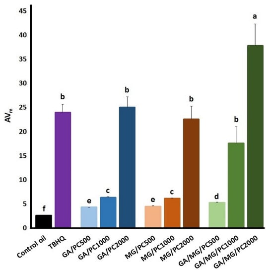 The power Equation (4) fitted well (R2 > 0.97) the changes in the AVs over the frying at 180 °C (Figure 3C). Figure 5 exhibits the empirical measures AVm. TBHQ efficiently prevented hydrolysis of the frying oil and, therefore, the following nutritional and toxicological deteriorations [,]. PC significantly improved the anti-hydrolytic effect of GA, MG, and their combinations as its concentration increased, and the highest efficiency belonged to the GA/MG/PC treatments. It is noteworthy to mention that the GA/MG 50:50 treatment with no significant anti-hydrolytic effect during frying in our previous study [] considerably improved the hydrolytic stability of the control oil when adding the increased concentrations of PC.