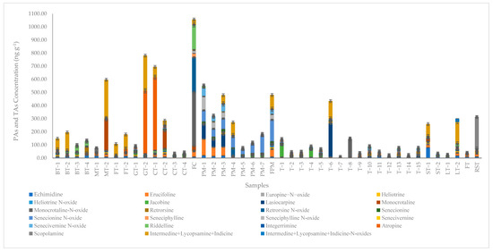 Pyrrolizidine alkaloids (PAs) are secondary plant metabolites that are naturally biosynthesized by angiosperms through defense mechanisms against herbivorous insects and pests. PAs and their N-oxides are a diverse class of secondary metabolites known as hepatotoxins in animals and humans. PAs are a class of phytotoxins that occur in an estimated 3% of flowering plants worldwide. More than 660 individual PAs and PANOs have been structurally characterized, and three plant families (Asteraceae, Boraginaceae, and Fabaceae) are among the most important sources of these toxins [1,2]. PA poisoning is caused by the consumption of herbal products containing these alkaloids for medicinal purposes or as culinary herbs. The pollution of plants with PAs, PANOs, and TAs, which are potentially harmful and toxic for humans and animals, can occur in different ways. Accidental or unintentional co-harvesting can be cited as the main source of plant contamination. Mixing the leaves of plants containing PAs with medicinal herbs or tea leaves and mixing the seeds of cereals with the seeds of plants containing PAs can be counted among other contamination pathways [3,4,5]. Beehive products (e.g., honey, royal jelly, and pollen food supplements) can naturally become contaminated with PAs through flowers, nectars, and pollen contents. It has been found that nectar from PA-diff or TA-producing plants is the main source of contamination of beehive products, and pollen from these flowers can additionally increase PA loads [6,7,8]. Animals may be fed with contaminated animal feed and plants. Thus, animal products (e.g., eggs, milk, cheese, and meat) can also be contaminated with Pas. Therefore, animal products may contain low levels of PAs [7,8,9,10]. In Hama and Strobel’s studies, it was reported that in regions with large populations of PA-producing plants, the surrounding soils and surface waters are vulnerable to PA pollution, and PAs can be transported from fields to surface waters by rain. With these studies, the importance of monitoring PAs in environmental samples has also been demonstrated [11,12].