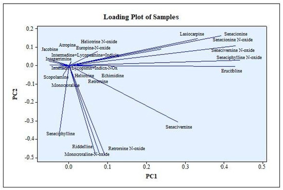 Although the overall effect of PC1 and PC2 was 35.49%, the separate classifications of the fresh chamomile and fresh mint samples is clearly seen in Figure 3. As can be seen from the PCA score plot, the fresh peppermint and dry peppermint samples were separated from the other samples and showed similar characteristics within themselves (Figure 3). The fresh chamomile sample was separated from all other samples. The grouping of fresh chamomile separately from the other teas was realized under the influence of retrorsine-N-oxide, seneciphylline, riddelline, senecivernine, and monocrotaline-N-oxides. While the peppermint samples differed from the other samples, they also showed similarity with the fresh peppermint sample. The fresh peppermint was separated by the effects of erucifoline, senecionine, lasiocarpine, seneciphylline-N-oxide, senecivernine-N-oxide, and senecionine N-oxide. It could be said that the effect of the PANOs was effective for the separation of the fresh plant samples from the other dry samples, and this may have indicated that the differences in the contents of the teas and culinary herbs may also have been due to the drying process. The differences between the fresh samples and the dry samples may also have revealed the importance of the drying process because the total PA amounts in the fresh peppermint and the fresh chamomile samples were above the limit values.