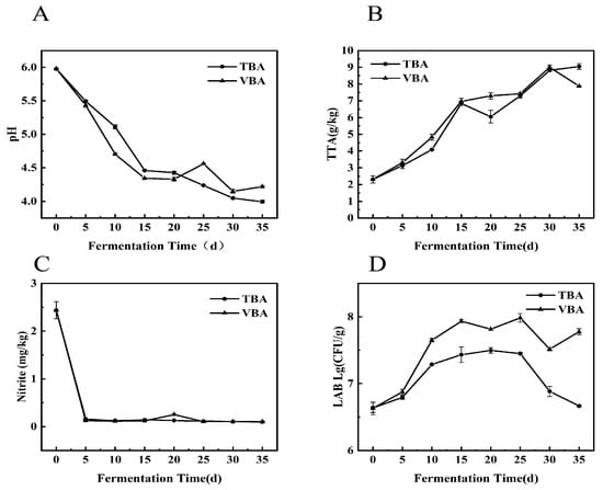 Biochemical properties of VBA and TBA during fermentation. (A) pH; (B) TTA; (C) nitrite; (D) LAB.