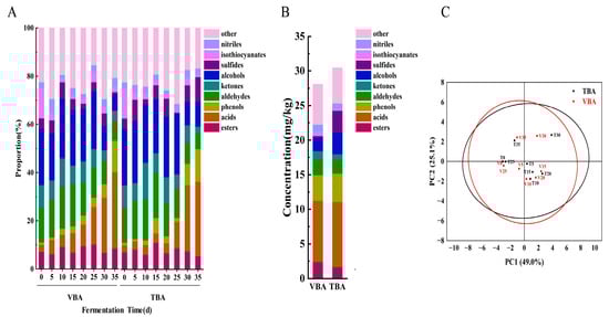 Variation of VOC during Apo pickle fermentation. (A) The proportion of VOC during the whole fermentation process of VBA and TBA; (B) The concentration of VOC in VBA and TBA on 35d; (C) The PCA of the VOC of VBA and TBA fermentation process. V represented VBA; T represented TBA; Numbers (0, 5,10, 15, 20, 25, 30, 35) represent fermentation time.
