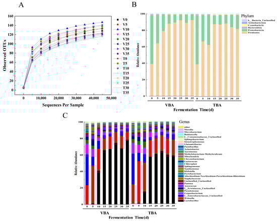 The Illumina HiSeq sequencing of Apo pickles. (A) Bacterial community OTU rarefaction curves; (B) the bacterial community of VBA and TBA at the phylum level; (C) the bacterial community of VBA and TBA at the genus level.