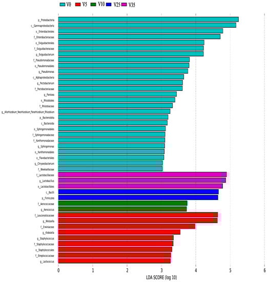 The above conclusions show that the dominant genera of VBA and TBA are the same in the fermentation process, but the content of LAB, which plays an important role in fermentation, is different. The LEfSe analysis of VBA during the fermentation is shown in Figure 4. The dominant genera were Lactococcus, Staphylococcus, Klebsiella, and Weissella at 5 d, Aerococcus at 10 d, and Lactobacillus at 35 d.