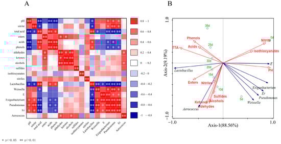 (A) A heatmap of Spearman rank correlation. Blue denotes a negative association for their content, and red denotes a positive correlation; (B) RDA between biochemical properties, VOC, and bacterial community in the fermentation. Process of VBA. * p ≤ 0.05, ** p ≤ 0.01. E, Er represented f_Enterobacteriaceae_Unclassified, f_Erwiniaceae_Unclassified. Green fonts represent time, blue arrows represent different kinds of bacteria and microorganisms, and red arrows and fonts represent biochemical indicators and VOC.