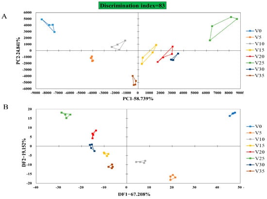 Electronic nose analysis of VBA. (A) PCA; (B) DFA. V represented VBA; Numbers (0, 5, 10, 15, 20, 25, 30, 35) represent fermentation time.