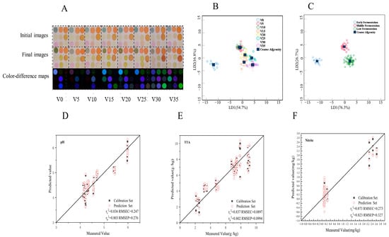 Data analysis of VBA by CSA detection. (A) Images of CSA for VBA at various stages of fermentation; (B) LDA data of CSA grouped by fermentation days; (C) LDA data of CSA grouped by different fermentation stages; (D) PLSR outcome plot of pH for VBA based on the CSA; (E) PLSR outcome plot of TTA for VBA based on the CSA; (F) PLSR outcome plot of nitrite for VBA based on the CSA. V represented VBA; Numbers (0, 5, 10, 15, 20, 25, 30, 35) represent fermentation time.