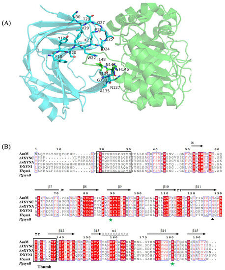 The multiple sequence alignment of AusM with the other five GHF11 xylanases was carried out using the ClustalW2 program (http://www.ebi.ac.uk/Tools/msa/clustalw2/, accessed on 10 August 2023). The above-identified amino acids of AusM, whose frequencies were above 80% among six xylanases, were considered conserved, while those frequencies were below 60%, and those that appeared in the resistant xylanase were deemed non-conserved to this work. Several residues were selected to be substituted with a smaller size Alanine or the corresponding ones among the resistant xylanase, respectively, to construct a series of mutants of AusM.