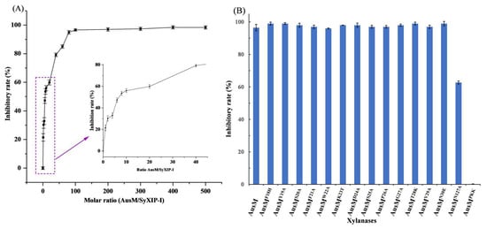 For the inhibitor sensitivity assay to SyXIP-I, both purified AusM and its mutants were used. The residual enzyme activity was measured by varying the molar ratio of inhibitor SyXIP-I to xylanase AusM (M/M). When the inhibition rate of AusM reached 50%, a molar ratio of 7:1 (SyXIP-I to AusM) was required, whereas more than 80 times the amount of SyXIP-I relative to AusM was necessary to achieve almost complete inhibition (Figure 2A). Therefore, using a higher inhibition addition at a molar ratio of SyXIP-I/xylanase of 100:1 as the criteria, the activity of fifteen mutants was measured respectively. The results showed that mutants AusMF18H, AusMY19A, AusMS20A, AusMF21A, AusMW22A, AusMK23T, AusMD24A, AusMS25A, AusMP26A, AusMG27A, AusMT28K, AusMV29A and AusMN30E were completely inactivated by the inhibitor SyXIP-I, while AusMN127A remained 62.7% of its initial activity and AusMPKK remained its initial activity with no activity loss. (Figure 2B). The xylanase activity of the mutant AusMPKK remained unaffected by the addition of SyXIP-I even up to a molar ratio of 200–500:1 (inhibitor:enzyme), as compared with 64.15–88.8% inhibition for the mutant AusMN127A. Compared to other methods reported in the literature, which were measured after xylanase was incubated with the purified inhibitor for 30 min [29,33], the method of this study was more suitable. Although SyXIP-I and xylanase bind quickly, it’s possible that adding them at the same time would require a higher concentration of SyXIP-I to achieve the same level of inhibition. Based on the above experiment, we expect that AusM is almost completely inhibited at low dosages during bread making (<2000 U/kg), while AusMPKK activity is reduced by less than 20%.