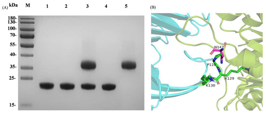 A stop codon was inserted at the C-terminus of the Syxip-I gene in the recombinant plasmid, resulting in the absence of a His-tag in the expressed protein. AusM, along with its mutants, incubated with an excess amount of purified SyXIP-I, respectively, for 30 min at 30 °C, were further purified by affinity chromatography utilizing a Co-nitrilotriacetic acid (Co-NTA) column. To determine whether the loss of inhibition measured in activity assays coincided with the interaction between xylanase and SyXIP-I, xylanases AusM and its best mutant were tested via binding assays without xylan substrate. The purified proteins were subsequently subjected to SDS-PAGE analysis. The purified xylanase AusM and its best mutant AusMPKK and SyXIP-I exhibited distinct single bands on the SDS-PAGE gel, with approximate molecular masses of 22 kDa and 34 kDa, respectively, aligning with their expected molecular weights (Figure 3A, lines 1–2, 5). However, for xylanase AusM, two bands were observed on the SDS-PAGE gel. One band corresponded to the xylanase, while the other corresponded to SyXIP-I (Figure 3A, line 3).