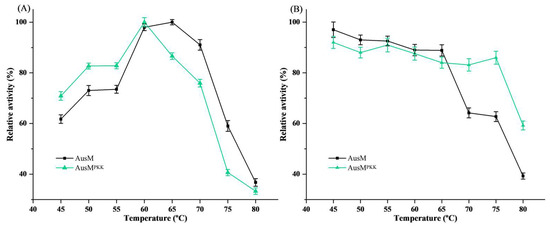 The optimum temperature and thermostability of AusM and AusMPKK. (A) The optimum temperature of AusM and AusMPKK; (B) The thermostability of AusM and AusMPKK. The AusM and AusMPKK were incubated in 50 mM Na2HPO4-KH2PO4 buffer (pH 7.0) at different temperatures (45 °C to 80 °C) for 1.0 h. Means and standard deviations of triplicate experiments are shown.