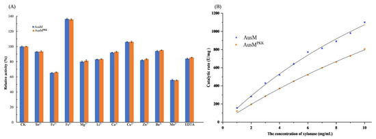 The effect of EDTA and metal ions on the activity of purified xylanases (AusM and AusMPKK) was determined by incubating the enzyme with various metal ions and EDTA at a final concentration of 5 mM. The metal ions tested included Sn2+, Fe2+, Fe3+, Mg2+, Li2+, Ca2+, Cu2+, Zn2+, Ba2+ and Mn2+. The mixtures were incubated at 25 °C for 1.0 h, and the relative activity was determined by comparing it to the activity of the mixture without the addition of any metal ions or EDTA. The experiments were conducted in triplicate.