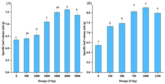 The effect of xylanase on specific bread loaf volume. (A), comparison of seven groups’ bread loaf volume. Groups with 0, 500, 1000, 2000, 3000, 4000, 5000 U/kg AusM, respectively. (B), comparison of six groups’ bread loaf volume. Groups with 0, 250, 500, 1000, 1250 U/kg AusMPKK, respectively. Means and standard deviations of triplicate experiments are shown. Different letters indicate significant differences (p < 0.05).