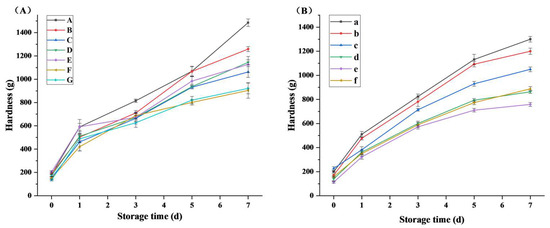 The effect of xylanase on the texture of bread. (A), comparison of seven groups’ bread hardness during storage. Groups A–G, with 0, 500, 1000, 2000, 3000, 4000, 5000 U/kg AusM, respectively. (B), comparison of six groups’ bread loaf volume. Groups a–f with 0, 250, 500, 1000, 1250 U/kg AusMPKK, respectively.