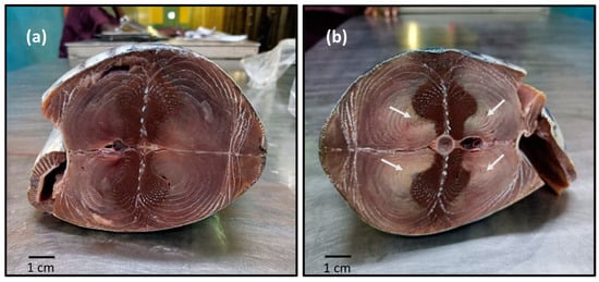 Despite the high societal and economic value of the tuna industry, a considerable amount of tuna catch is lost due to various flesh quality issues. Some of the flesh quality issues known to the tuna industry are “decomposition and spoilage associated with high histamine” [,,], “burnt tuna” [,], “jelly flesh” [,], “honeycombing” [,,], and “Mushy Tuna Syndrome” (MTS) []. MTS is a post-harvest textural quality defect in tuna wherein pronounced proteolytic softening of tuna meat is evident during processing, resulting in a canned product with an unacceptably mushy texture []. While MTS may affect raw fish [], it mostly causes a high number of rejections and the downgrading of processed fish for canning []. MTS can be identified as a white, soft exudate in the region closest to the backbone of the fish and is found predominantly in skipjack tuna (Katsuwonus pelamis) [] (Figure 1a,b). An unpublished study by Kaneko and Nakamura [] was conducted on a single voyage of a purse seiner in Pago Pago in 1996, which recommended further study with a larger sample for understanding the predisposing factors of MTS. While Stagg et al., [], found that raw fish with severe MTS showed higher levels of proteolysis, no research has investigated factors that contribute to the occurrence of MTS in raw tuna. This is particularly important because skipjack tuna is the dominant variety of tuna, making up 57% of global catch, and is reportedly sold in nearly every region of the world []. Skipjack is also the most sustainable for tuna fishery as the species is very fast-growing and relatively short-lived [,], showing a rapid turnover of their population [].