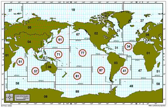 FAO, fishing zone map; encircled are the fishing zones where the respondents who experienced MTS received skipjack tuna from.