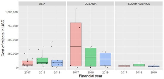 Boxplot of cost of rejection in USD due to Mushy Tuna Syndrome reported by participants in an industry survey Asia (n = 12), Oceania (n = 4), and South America (n = 3).