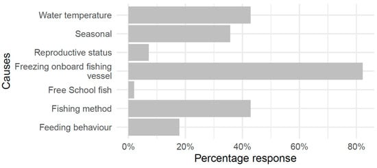 To understand industry perceptions about the likely causes of MTS, participants were asked to indicate which of seven potential causes they thought was the predominant cause for MTS (fishing method, onboard freezing, seasonal, free school fish, reproductive status, feeding behaviour, sea surface temperature, or other). Respondents (n = 28) noted more than one cause. On-board freezing in the fishing vessel was marked as a potential cause by 82% of the respondents, whereas sea surface temperature and fishing method were equal at 43%. A total of 39% of respondents indicated reproductive status as a potential cause, followed by seasonal factors (36%), feeding behaviour (29%), and free school catch (7%) (Figure 5). One of the participants stated that it was more common in fish weighing more than 3.4 kg: “Normally we find mushy in tuna weighing >3.4 kg”, and another said that “When the fishing is very good, the MTS is more common”.