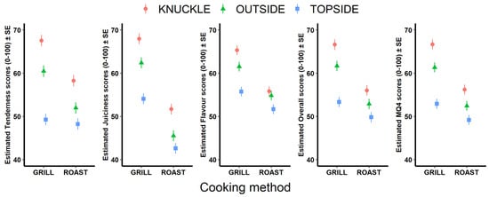 Estimated marginal means (±S.E.) for tenderness (0–100), juiciness (0–100), flavor (0–100), overall liking (0–100), and MQ4 score (0–100) from the base models for consumer sensory scores of the Knuckle, Outside flat, and Topside cooked using the grill and roast methods.