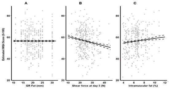 Estimated marginal means from the base model for the effect of (A) GR fat (mm), (B) shear force at day 5 (N) and (C) Intramuscular fat (%) for both grill and roast methods on the meat quality score (MQ4) calculated using the following weightings (30% tenderness, 10% juiciness, 30% flavor, and 30% overall liking).
