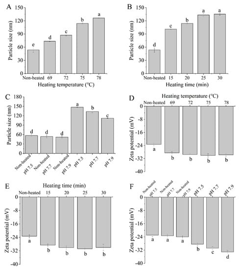 Heat−induced changes in the particle size and zeta potential of goat milk whey protein ((A,D) heating temperature, (B,E) heating time, (C,F) pH). Different letters are significantly different (p < 0.05). Error bars represent the standard deviation of the means.