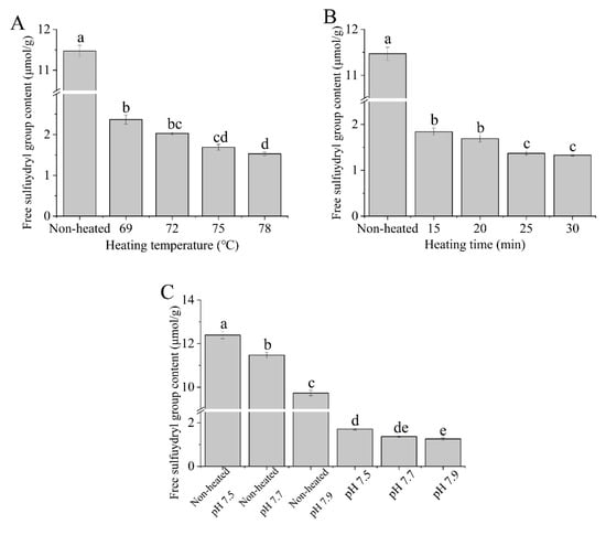 Heat−induced changes in the free sulfhydryl group contents of goat milk whey protein ((A) heating temperature, (B) heating time, (C) pH). Different letters are significantly different (p < 0.05). Error bars represent the standard deviation of the means.