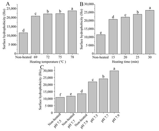 Heat−induced changes in the surface hydrophobicity of goat milk whey protein ((A) heating temperature, (B) heating time, (C) pH). Different letters are significantly different (p < 0.05). Error bars represent the standard deviation of the means.