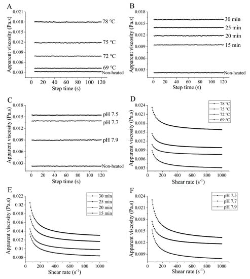 Figure 4 presents the apparent viscosity of the samples. The apparent viscosity of the heated samples increased with higher heating temperatures ranging from 69 to 78 °C (Figure 4A) and prolonged heating times from 15 to 30 min (Figure 4B), which is logical and consistent with the observed changes in particle size (Figure 1A,B). The process of heating leads to the disruption of various intramolecular bonds that stabilize the native goat milk whey protein structure. Beyond a certain temperature, protein molecules unfold and subsequently aggregate. These aggregates tend to be larger in size, exhibit greater asymmetry in shape, and possess a larger effective volume fraction compared to the native molecules, resulting in an increase in viscosity. However, it is essential to note that viscosity is influenced by numerous molecular properties, including size, shape, and flexibility [35]. All of these factors may be attributed to the observed increase in viscosity. Similar findings of increased apparent viscosity after heat treatment were reported by O’Loughlin et al. [36] on cow’s milk whey protein. In Figure 4C, the apparent viscosity of the heated samples decreased as the pH values increased from 7.5 to 7.9. This decrease can be attributed to the strong electrostatic repulsion at higher pH values [37].