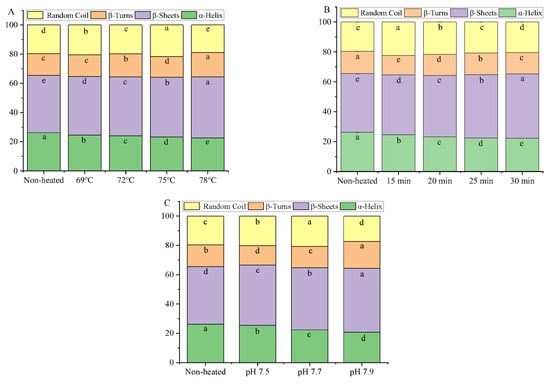 Heat−induced changes in the secondary structure contents of goat milk whey protein ((A) heating temperature, (B) heating time, (C) pH). Different letters are significantly different (p < 0.05). Error bars represent the standard deviation of the means.
