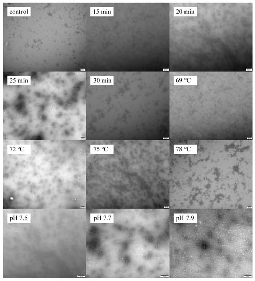 The microstructure of the samples is shown in Figure 7. The native goat milk whey protein (control) displayed an irregular shape with slight aggregation. With an increase in heating time from 15 to 25 min, the particle size of the heated samples increased, and a uniform protein network was observed. However, when the heating time exceeded 25 min, the protein’s spherical structure transformed into a chain structure, resulting in the formation of a network of larger aggregates. Furthermore, increasing the heating temperature from 69 to 75 °C resulted in the formation of larger and more uniform protein particles. When the heat temperature increased to 78 °C, the particles agglomerated into large clusters. This phenomenon can be attributed to the protein interactions at higher temperatures, resulting in the agglomeration of protein particles [9]. As the pH values increased from 7.5 to 7.9, while maintaining the heat treatment at 75 °C for 25 min, the particle size of the aggregates significantly decreased. This trend of change was confirmed by dynamic light scattering measurements.