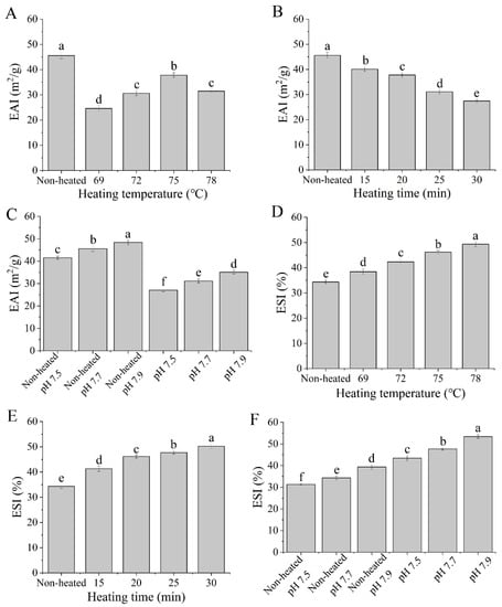 Heat−induced changes in the emulsifying properties of goat milk whey protein ((A,D) heating temperature, (B,E) heating time, (C,F) pH). EAI = emulsifying activity index; ESI = emulsion stability index. Different letters are significantly different (p < 0.05). Error bars represent the standard deviation of the means.